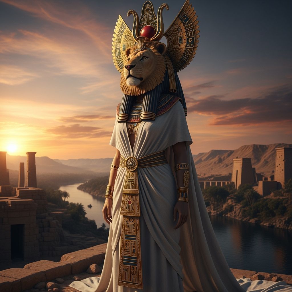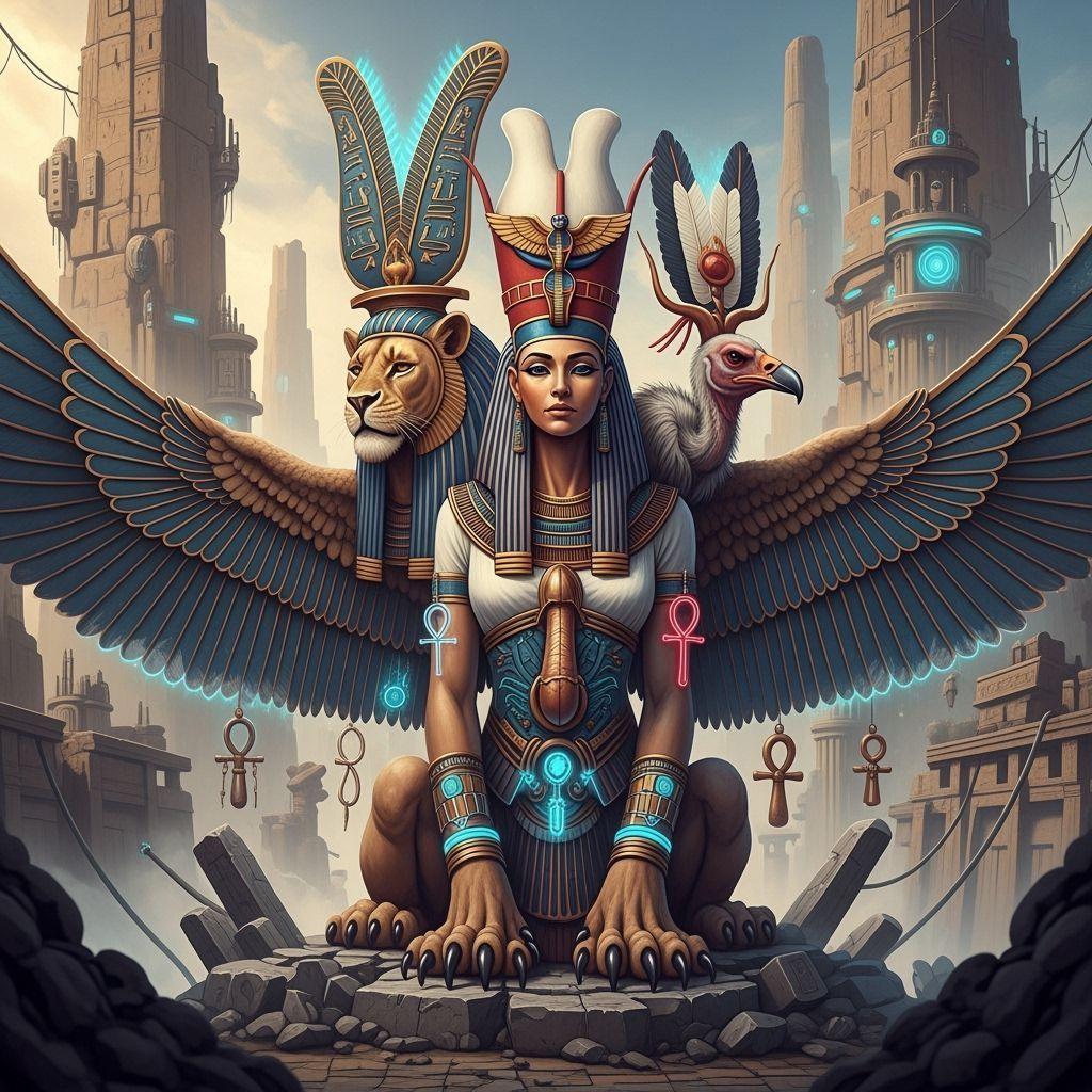 „Zu sprechen über einer Gestalt der Mut mit drei Köpfen: einem der PACHET mit Doppelfeder, einem der Pat-Menschen mit weißer und roter Krone, und einem des Geiers mit Doppelfeder; und mit Phallus, Flügeln und den Pranken eines Löwen.“