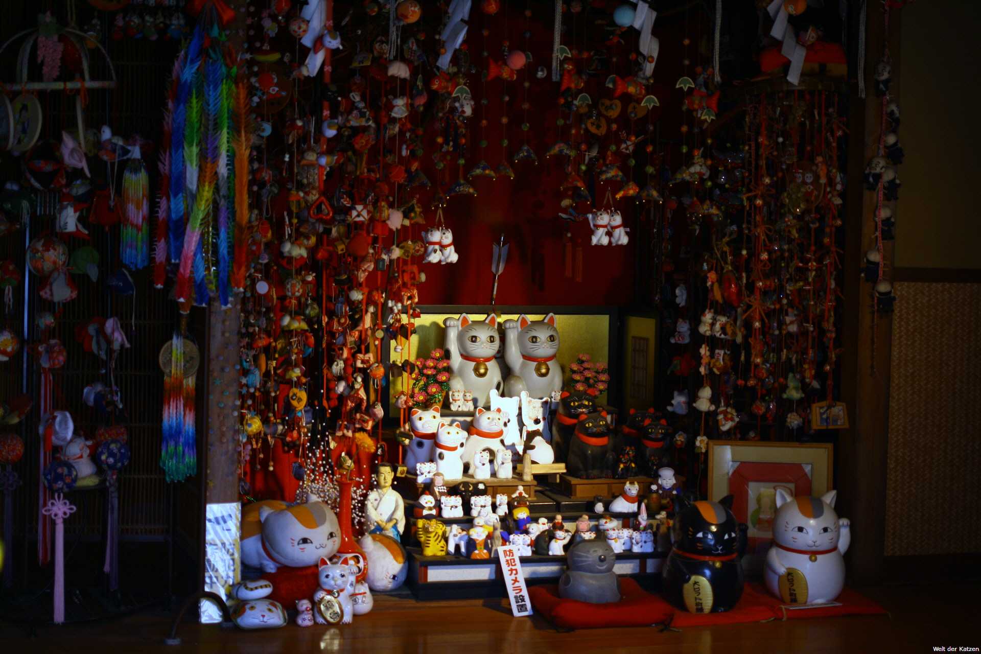 Maneki-Neko ist ein Glückssymbol. Das rechte, erhobene Vorderbein verspricht finanzielle Unabhängigkeit, das linke sorgt für zusätzliche Kunden (und somit auch wieder für Wohlstand).