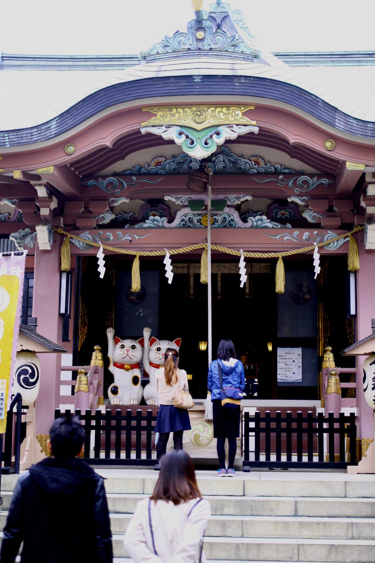 Die bekannteste handelt von einem armen Mönch, der keine Almosen mehr bekam, da die Bevölkerung ebenfalls hungerte. Bei der Suche nach übriggebliebenem Korn auf einem Feld entdeckte er in der Ferne eine Katze. Das Tier schien in seine Richtung zu winken. Er lief zu ihr, doch immer wenn er fast heran war, lief die Katze weiter, drehte sich zu ihm um und winkte erneut. So ging es einige Male und als der Abend nahte, brach der Mönch vor Erschöpfung nahe einer Stadt zusammen. Die Bewohner nahmen ihn auf und pflegten ihn gesund. Als er eines Tages durch die Stadt streifte, sah er in der Ferne auf einem Hügel erneut die winkende Katze sitzen. Er lief den Hügel hinauf, setzte sich neben die Katze und begann zu beten. Er betete bis in den Abend und seine Stimme wurde in der eintretenden Nachtruhe gehört. Menschen kamen heran, beteten mit ihm und sie waren so bewegt, dass sie einen Tempel auf dem Hügel errichteten. Am Eingang dieses Tempels saß fortan die Katze und winkte die Menschein herein.