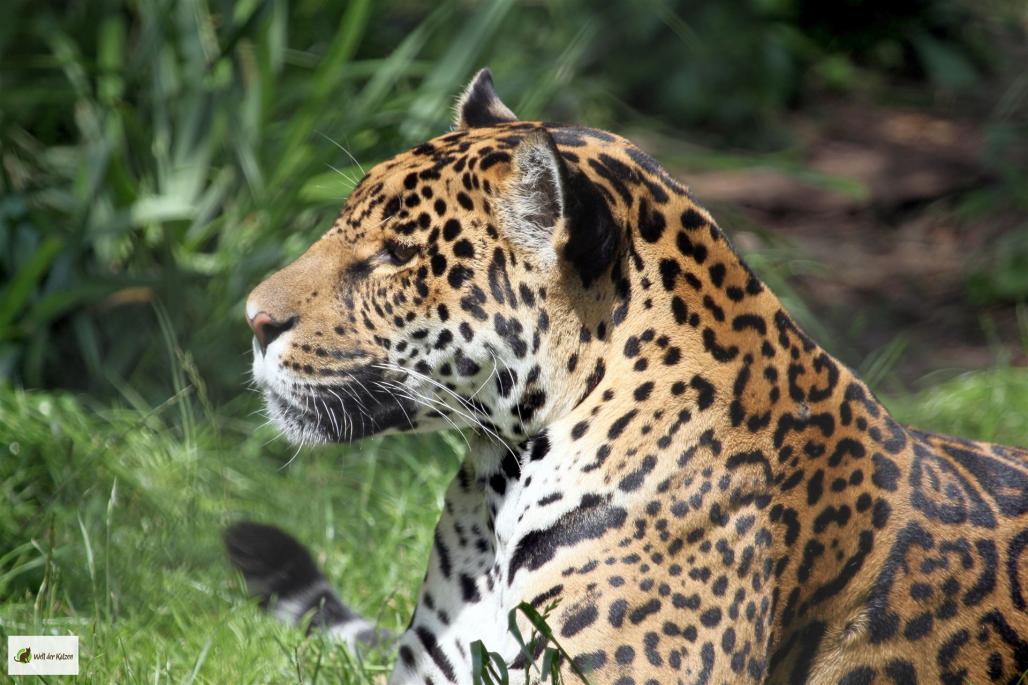 Der Jaguar ist die einzige Großkatze der Neuen Welt und drittgrößte Katzenart nach Tiger und Löwe. Er ist von gedrungener Statur, mit kräftigem, gerundeten Kopf. Neben der häufigen, gelblich-sandigen Körperfarbe mit dunklen Flecken, kommen auch melanistische (schwarze) Exemplare vor.