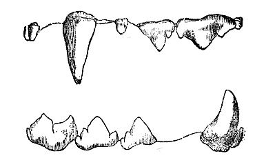 Auf die sehr kleinen Schneidezähne folgen gewaltig große Eckzähne, endlich Backenzähne, die, mit vorzugsweis glashartem Schmelz überzogen, querüber keinen großen Durchmesser haben, zusammengedrückt und keilförmig gestaltet ohne Schwierigkeit in einen Gegenstand eindringen. Der Reißzahn des Oberkiefers ist dreispitzig, derjenige des Unterkiefers zweispitzig, und beide gleiten so genau und schneidend an einander vorüber, dass, in diesem Falle, die früher angewendete Vergleichung dieses Theiles des Raubthiergebisses mit Scherenblättern vollkommen gerechtfertigt erscheint. Der einzige Höckerzahn steht im Oberkiefer als letzter der Reihe, ist so klein, dass er kaum über den Kieferrand vorragt, hat eine platte Gestalt und eigentlich keinen Gegner im Unterkiefer, scheint aber dem hintersten Zacken des unteren Reißzahnes entgegenwirken zu können." [2]