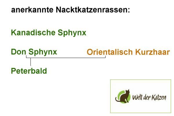 Nacktkatzen ist die Sammelbezeichnung aller nahezu haarlosen Feliden. Im Volksmund wird oft auch von "Sphynx" gesprochen. Derzeit gibt es drei anerkannte Sphynx-Rassen.